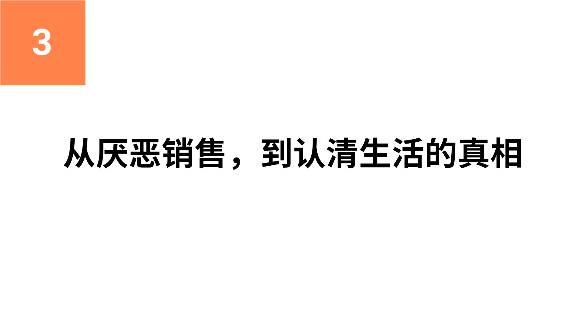 这句话让我醍醐灌顶,我好像找到了救命稻草,开始不再排斥销售,甚至主动去学习销售。 虽然我意识到位了,但潜意识里还是害怕销售,工作多年,对传统销售耳濡木滥,觉得自己对于做销售这件事情还是没有信心。 觉得自己不是做销售的那块料。 。