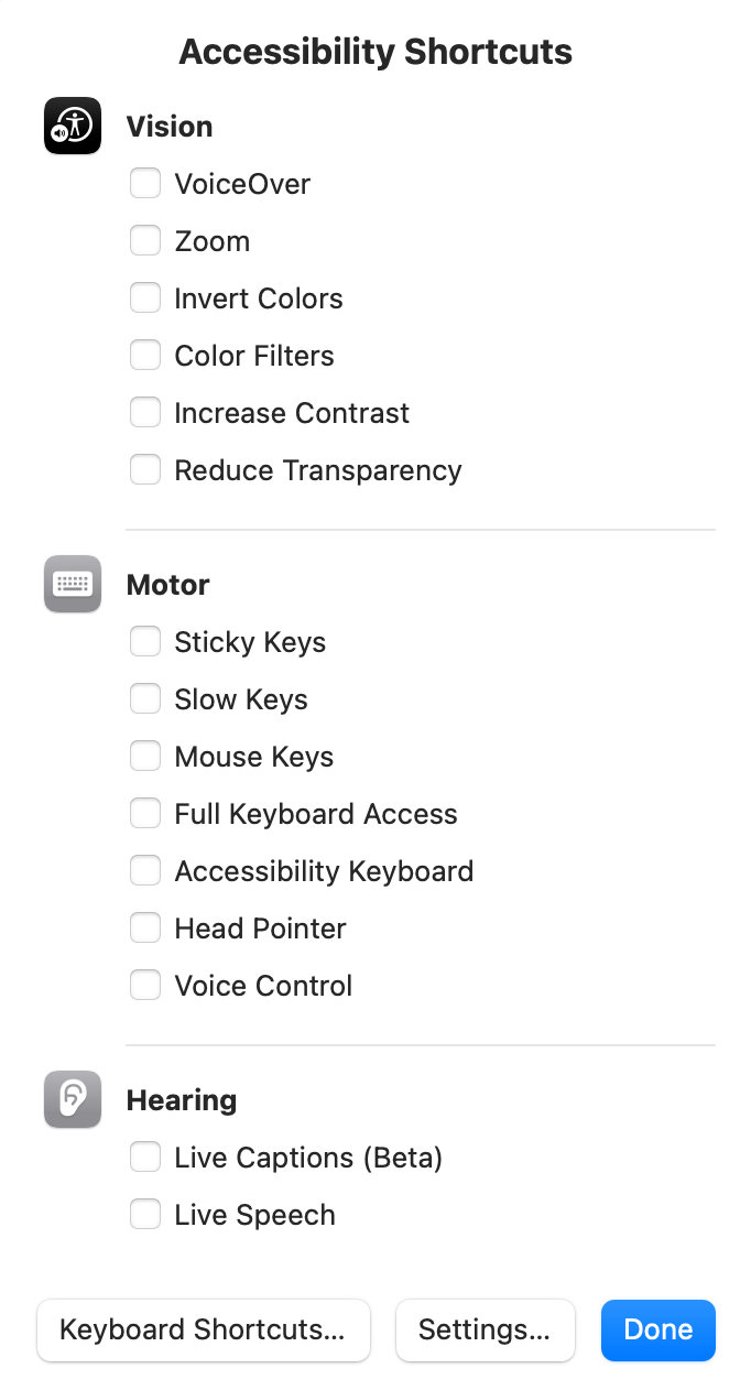 macOS 系统有个快捷键,Option + Command + F5,可以呼出 Accessibility Shortcuts 对话框