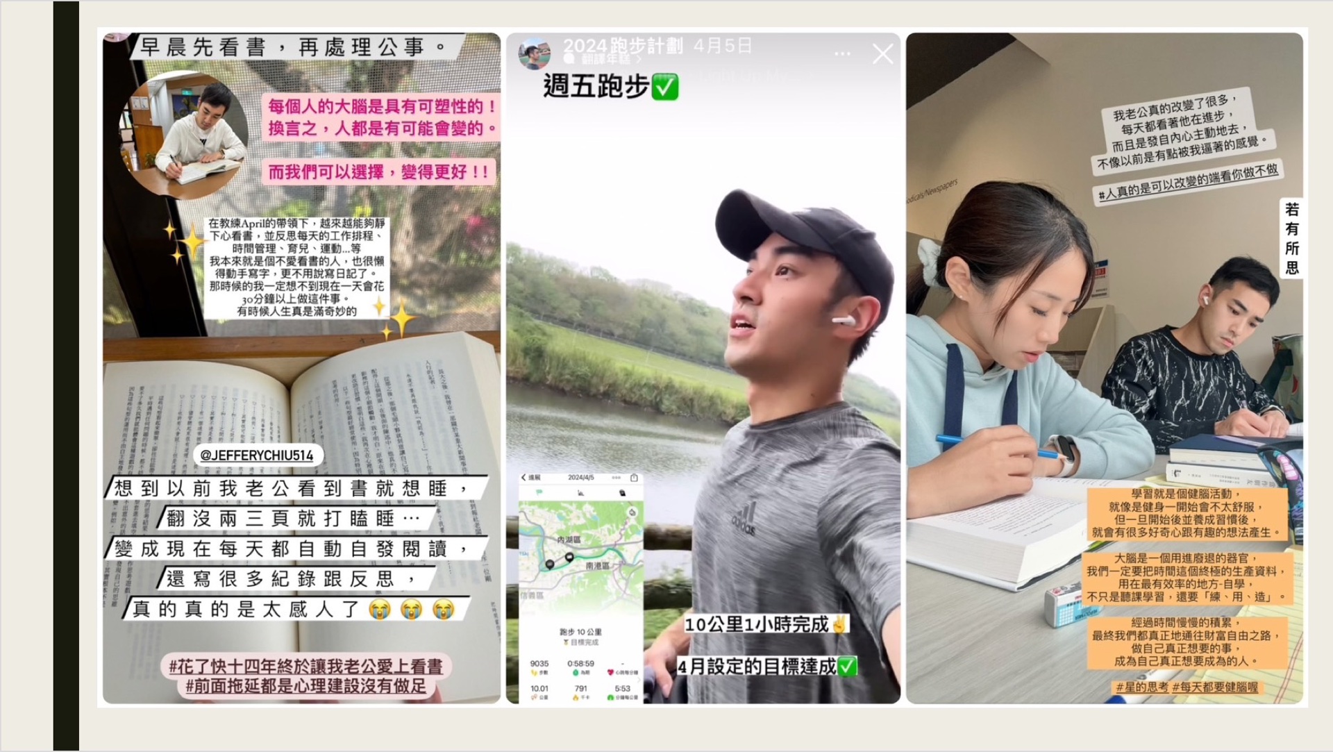 我也开始每天固定运动至少30分钟,雷打不动的,大概已经持续快一个月。 然后身材上面也是发生蛮显著的变化。 因为之前减肥都用不正确的方式,然后也开始阅读英文原版书就是夏爱老师推荐的这个bud,并且常常跟家人分享,朋友分享我的读书心得在我自己的个人爱句上面,那这些习惯呢就让我每天都能够知道自己在做哪些真正重要的事,就是每天一定要读书健身投资帮朋友陪家人,每日无省无声 。