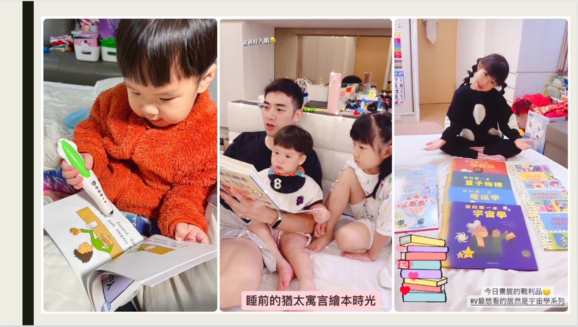 我们也用上老师的方法,每天在孩子面前读书运动,并且带着孩子一起。 在日常生活中,也常常使用英语,还有台语,跟孩子做沟通,为他们创造多余的环境。 我们也每天陪着孩子重复阅读好的故事书,我们每天睡前必读的有犹太寓言绘本,谭目的以及幸福孩子的7个好习惯。 现在我家快2岁的小宝,只要一看到我就会一直喊书书书要我念书给他听。