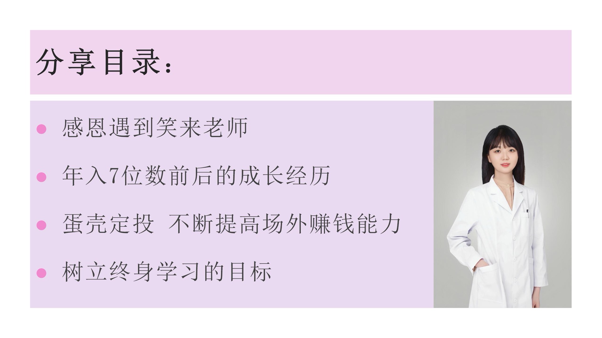 同时在研究生期间啊,也没有耽误学业,拿到了梦寐以求的研究生国家奖学金,还有其他的一些荣誉证书。 这些钱正好可以还掉我本科的助学贷款,这些都是靠自己努力得到的,让我更加相信一份努力,一份收获啊,也正因为自己不断在精进。 呃以在30岁生日到来之前实现了年入7位数的小目标。 啊,因为我一直都在持续学习,这个收入也一直在增长啊,然后有了一个阶段性的小成果。