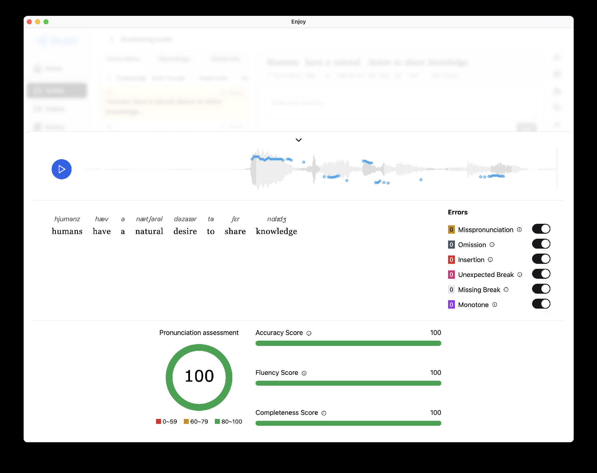 所以呢这个呃我练英语的动力啊,我渐入佳境了。 然后啊在最近的一个月左右的时间里啊我在做跟度训练的时候呢嗯那个语音评估的部分啊可以把100分的句子越来越长了。