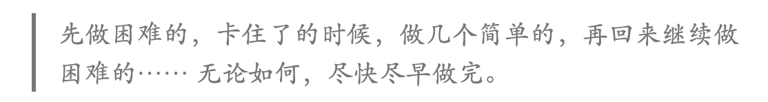 这就是习惯或者说顺序的重要性。 那再比如说哈上学的时候啊,我们要做作业,我们要做练习题,先做简单的呢,还是先做困难的呢? 哎,这就是流程管理,而一切的流程重复多了就成了所谓的习惯。 那做作业做练习最好的习惯是什么呢? 啊,是先做困难的,卡住来的时候呢,做几个简单的,然后再回来继续做困难的啊,无论如何啊要尽快尽早做完。