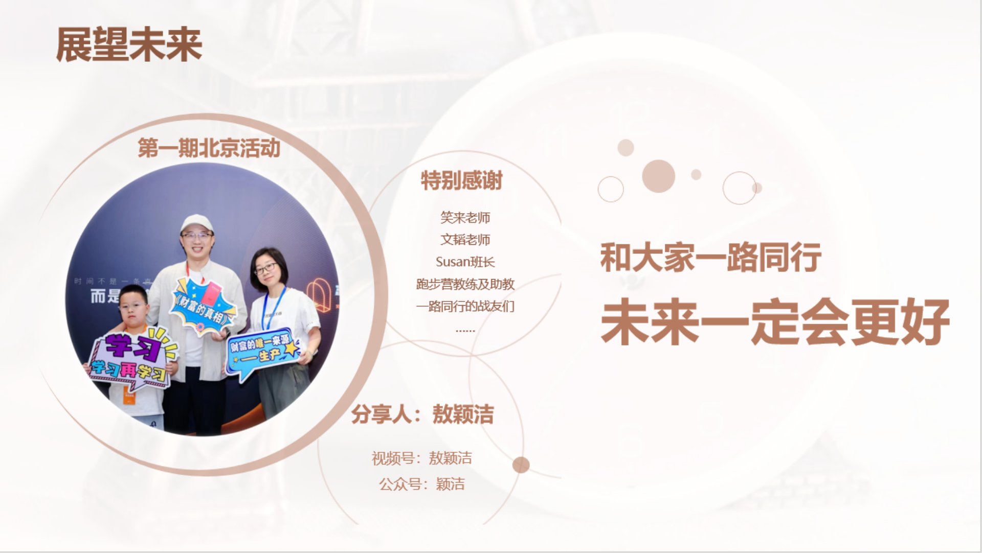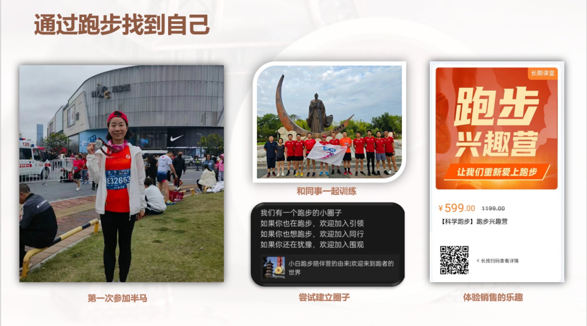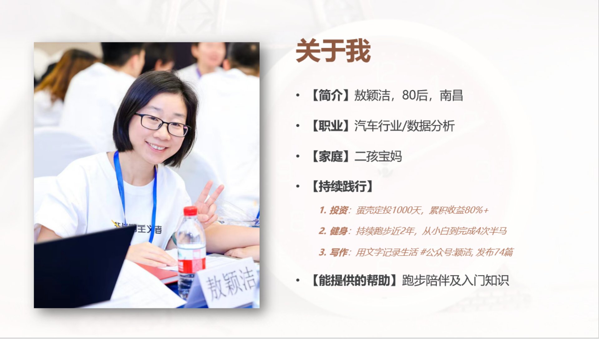 分享内容:①投资路上踩过的坑 ②通过跑步找回自己 ③用行动影响家人