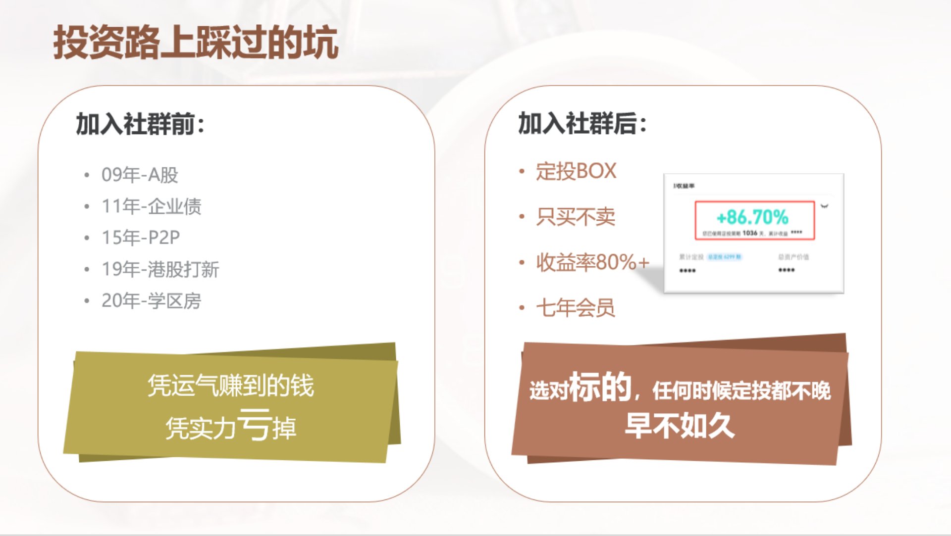 当时我在社群里唯一的动作就是定期换衣,买韭菜盒子,时不时会去看看价格,然后幻想着财富自由。 即便是这样,我的定投之路也并非一帆风顺,由于没有好好读书听课。 当我遇到第一个大波动时,账户接近腰斩。 在最应该定投的时候,我摁下了暂停键,错过了底部的美好。 。