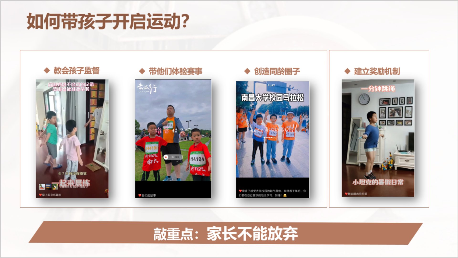 带孩子一起运动:①教会孩子监督 ②体验赛事乐趣 ③创造同龄圈子 ④建立奖励机制 最重要的是家长不能放弃。