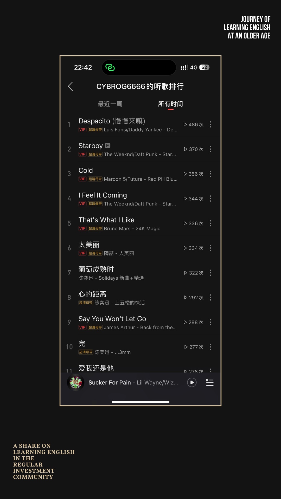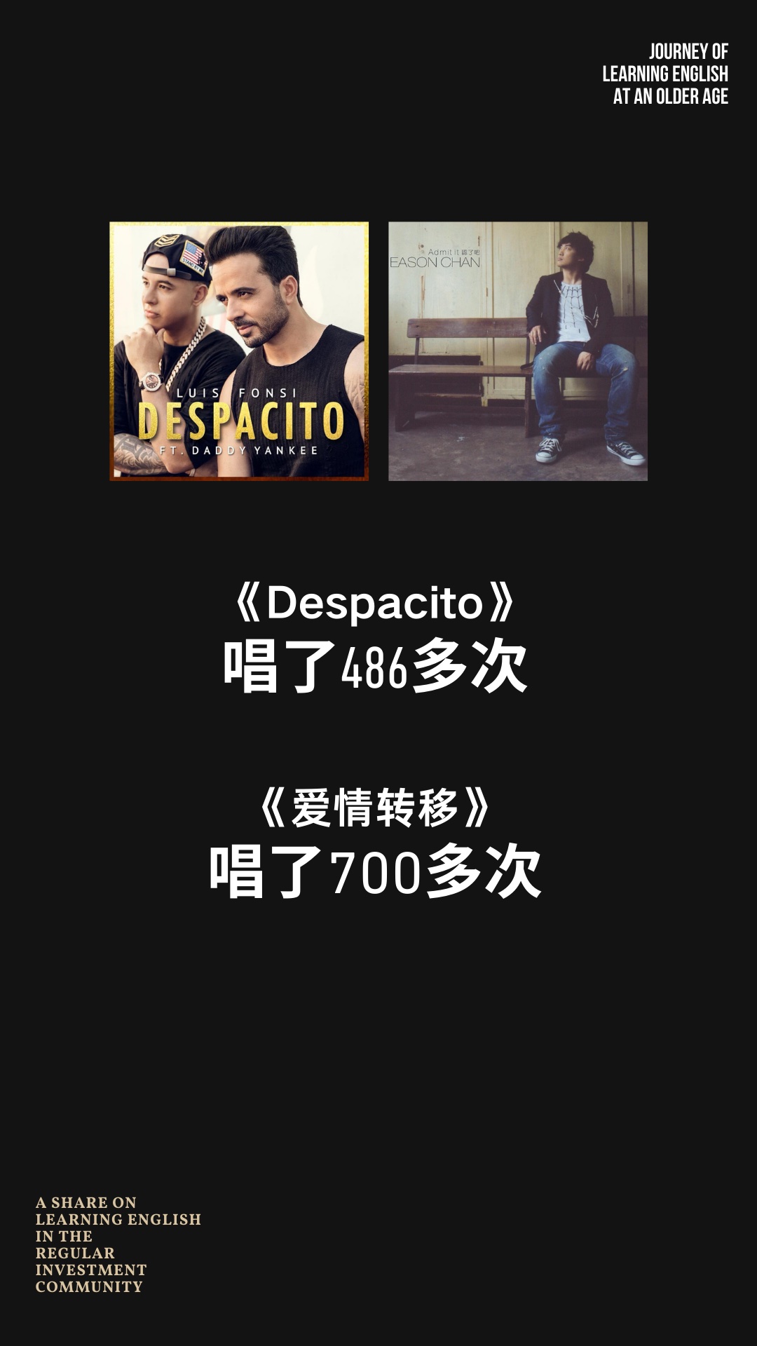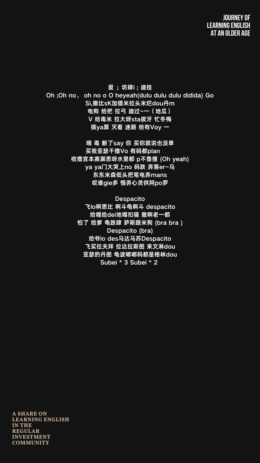 这是我的网易云音乐历史听歌排行,最多播放的一首,despacito,听了 486 次。这是一首几年前很火的歌,西班牙语,其中还有说唱段落。因为很火,所以我想学着唱,这486遍每一遍都是一边听一边跟着唱,我当然不懂西班牙语,不过这无所谓,我找了音译歌词,硬练,如下图。