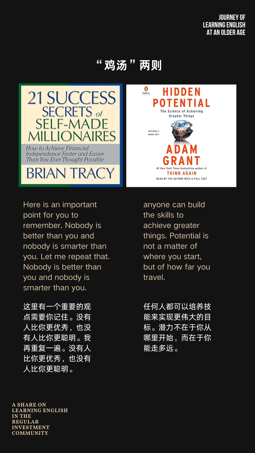 其中一句是“老朋友”:《The 21 Success Secrets of Self-Made Millionaires》的一句话:Here is an important point for you to remember. Nobody is better than you and nobody is smarter than you. Let me repeat that. Nobody is better than you and nobody is smarter than you.(这里有一个重要的观点需要你记住。没有人比你更优秀,也没有人比你更聪明。我再重复一遍。没有人比你更优秀,也没有人比你更聪明。)