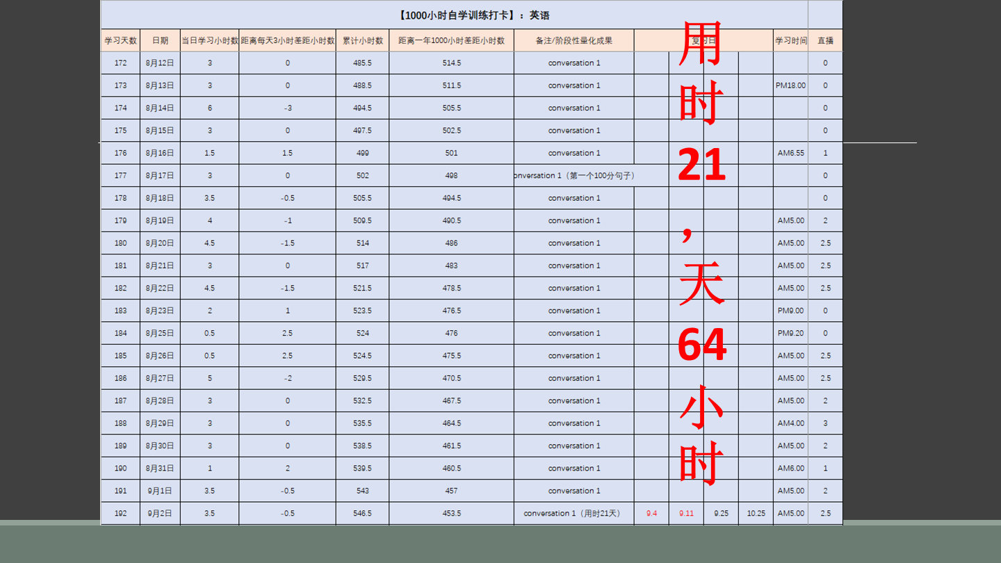 发脾气,发牢骚的时间长了,大脑就开启了原认知,意识到自己这样是错误的,得优化我的学习时间安排。 我就在下了班在单位学习3个小时后回家。 后来我发现在单位学习的3个小时,不能太大声的去朗读得稍微晚一点才可以。 坚持一段时间发现不大声朗读就会效效果大打折扣。 且陪伴家人的时间就少的可怜。 我再一次认为我的这个流程不是最优的,我得继续调整。 后来老师说把一天中最重要的事情,尽量放在睡觉醒来的第一件事,于是我开始尝试每天早上4点50起床,读到7点30送小朋友上学,这样就已经完成了2. 5个小时了。