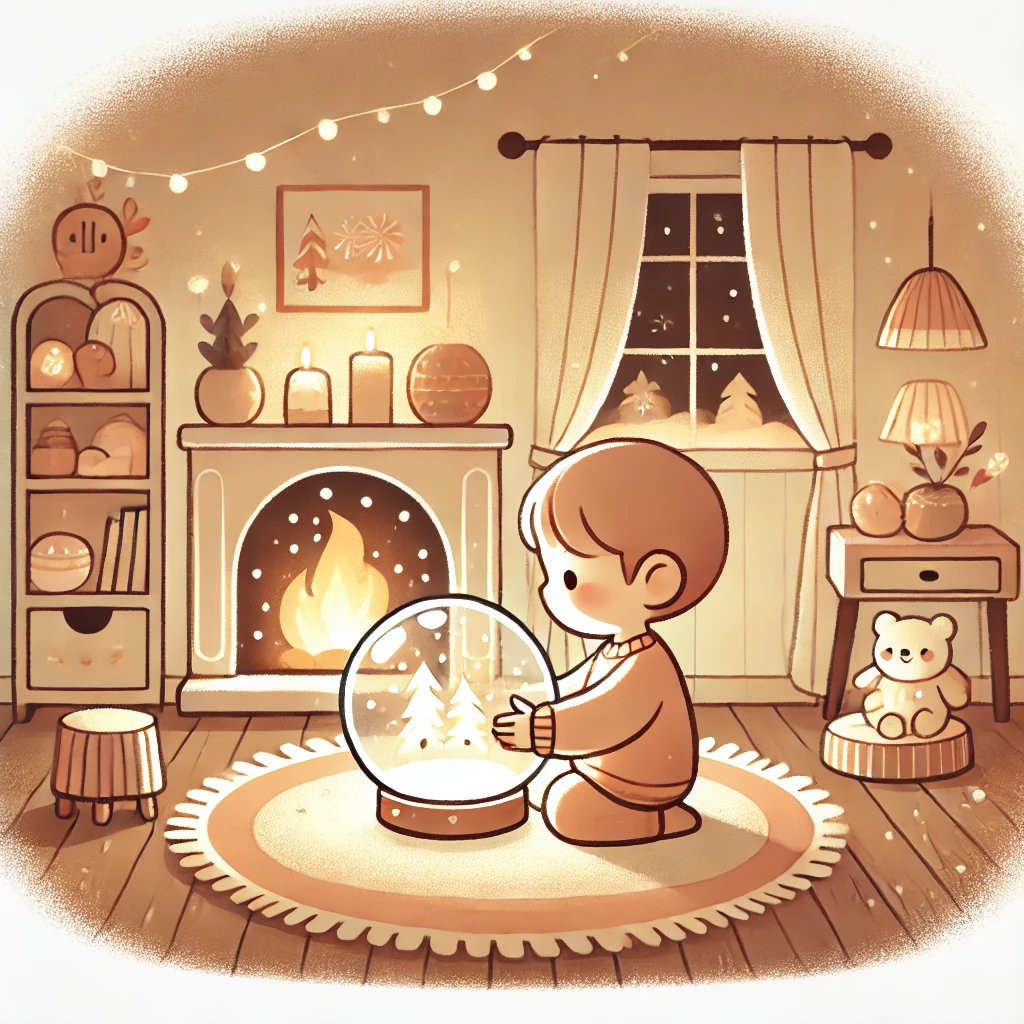 One chilly evening, little Lily was sitting by the fireplace with her favorite toy bear, Mr. Fluff. She found a shiny snow globe on the shelf and held it up, its glow lighting up her curious face. Inside the snow globe was a tiny, snowy world with twinkling trees and a cozy cottage.