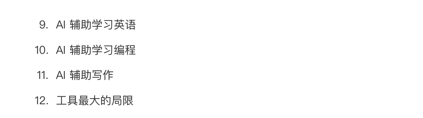 其实呢我原本的课程计划里面呢,还有后面包括四节课哈,一个是AI辅助学习英语AI辅助学习编程AI辅助写作的。 然后呢,最后有一个总结的章节,就是工具的最大局限是什么啊,然后呢这个这个还有一些辅录什么的哈。 但是呢这一轮讲解呢,我们讲到第八节课已经做一个展展停啊,就已经结束了。 然后呢,我相信这八节课呢已经能够让同学们哈有比较深刻的理解,以及自身发生一些巨大的变化,不仅是自身的变化,也有对家庭教育的啊重新理解。