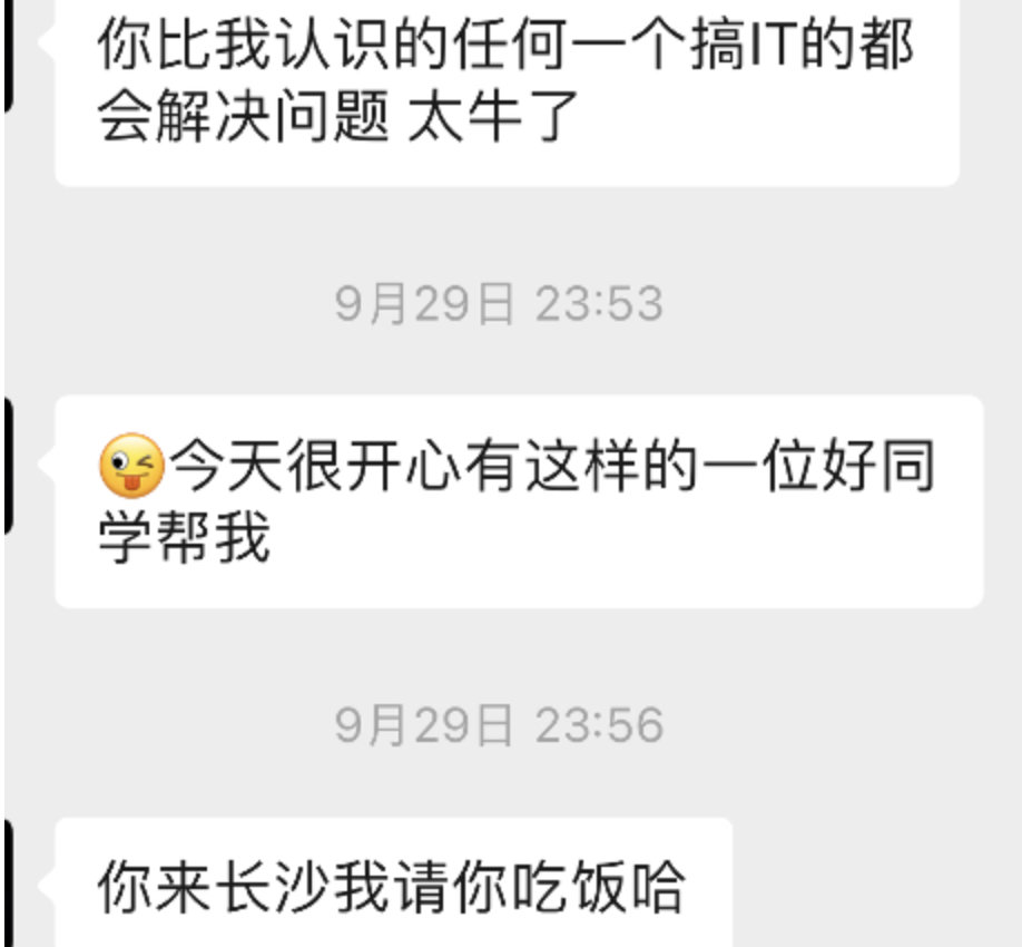 对我而言,名望其实就是从事情中来,从我一次又一次的帮助他人解决问题中积累而来,前前后后至少有帮助过100多位社区同学解决问题。 这个过程中呢有的社情同学帮我推荐给其他同学,有的说要请我吃饭,有的觉得我解决问题的能力其实比搞IT的更强。 甚至有的同学加我微信,为了感谢我。