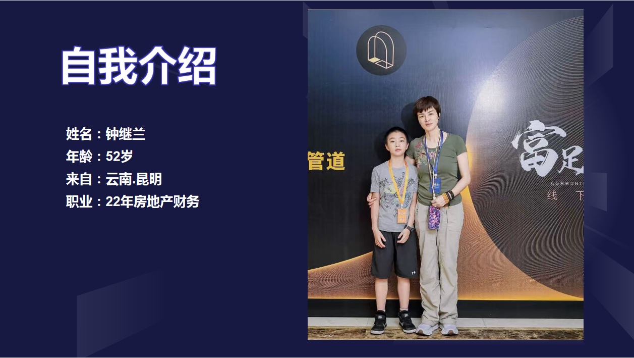 各位定投健询群的战友们,大家早上好,我叫钟继兰。 今年52岁,来自云南昆明。 有一个11岁的儿子。 我是一名资深的房地产财务人员,拥有22年的从业经验,同时也是也是一名会计师和注册税务师。 我今天分享的主题是如何找到属于自己的灯塔。