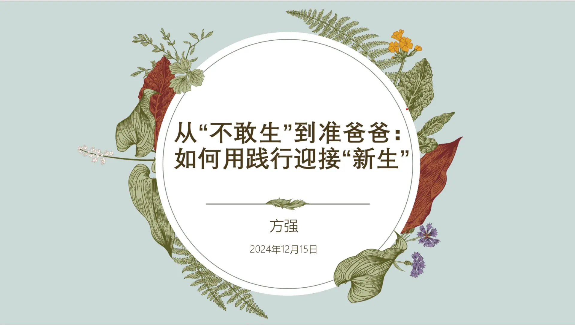 .嗯,肖丹老师、苏丹老师以及各位战友们,大家好。呃,我是方强,目前是我们富足人生社群成员啊中的一员。然后今天由我来给大家分享,真的很高兴苏珊老师,然后能来邀请我进行这次分享。啊,我现在真的是既紧张又兴奋。我今天分享的题目呢是从不敢生到准爸爸。😊如何用践行迎接新生?这里的新生呢,我把它打了一个引号,这里有两个含义,一个是指孩子,一个是指我自己在重新读完这边稿件的时候呢,我把这个挑战换到了这个具体的新生。