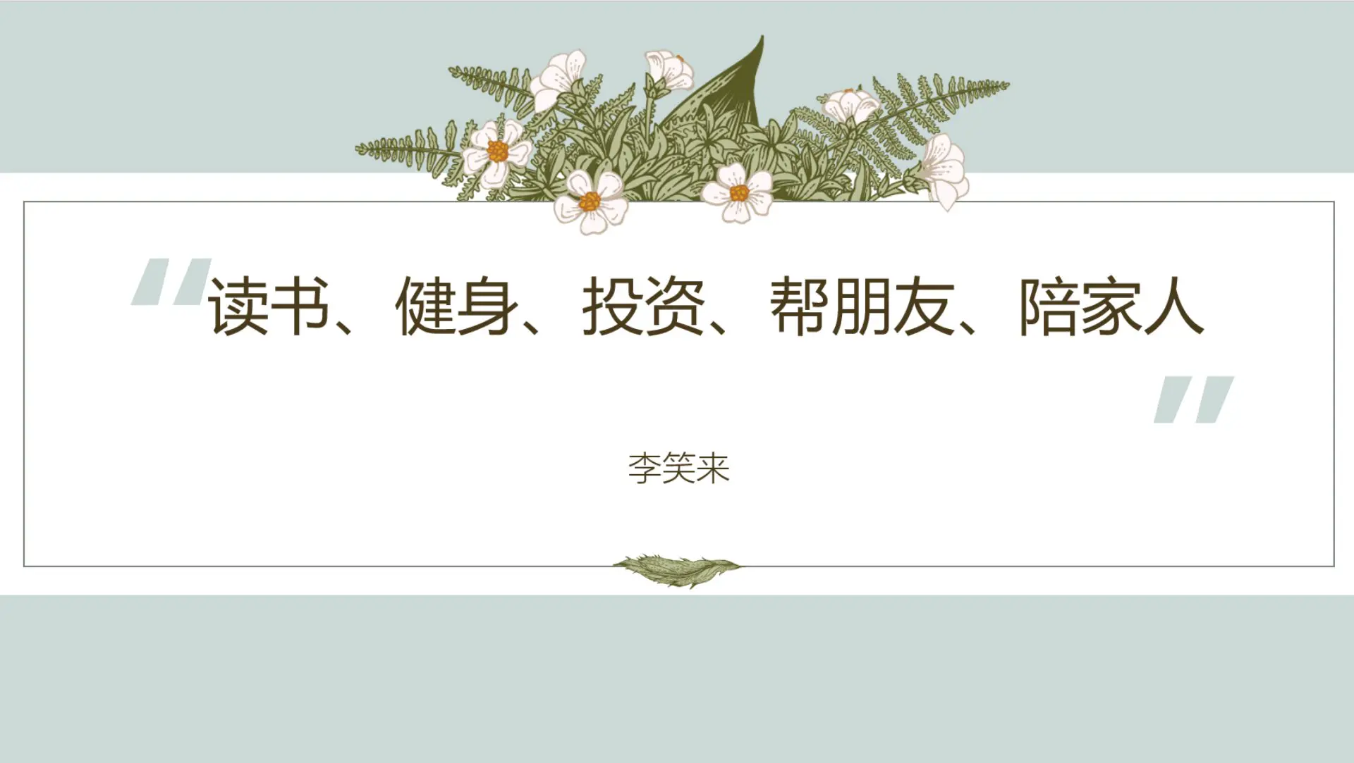 .方强,当你看到这段话,我虽然不知道你活在哪一辈子,你可能有了皱纹,你的孩子可能也有了孩子,你的智能管家可能已经为你做好了早餐。但我知道你已经拥有了富足的人生,你的家族会传承下去,你也会给世界带来改变。而且你知道你还会继续践行下去。读书健身投资,帮朋友,陪家人活在未来。这就是我今天的所有分享,谢谢你的收听。