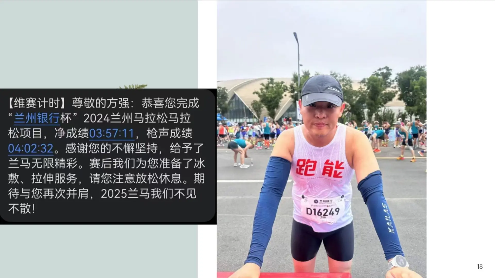 .如今我的闹铃时间已经来到了4点30分,而且现在做到了自然就会醒,不需要特别多的挣扎。通过跑步呢让我远离了疾病,基本上这些年就没有生过太大的疾病。。而且生活变得规律。在运动中呢,我收获到了健康的身体与大脑。在今年呢,我也在杨康刚刚就是康复的情况下,顺利完成了亚高原兰州马拉松的比赛,并且PB进入了4小时大关,达标了马拉松大众二级。