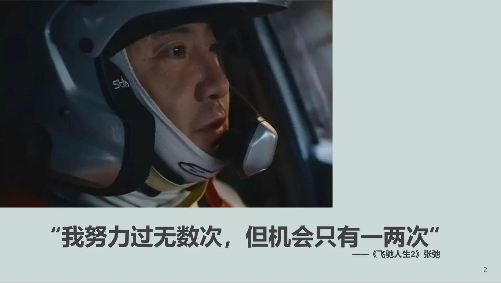 其实苏桑老师找到我这次去分享的时候,我内心是非常的忐忑,然后也不知道自己去讲什么。但是我仔细想了想,嗯,就想到了前段时间看的一个电影,就是飞驰人生2里面张弛的一段话,就是我努力过无数次。但是机会只有一两次。于是我选择抓住这次机会。