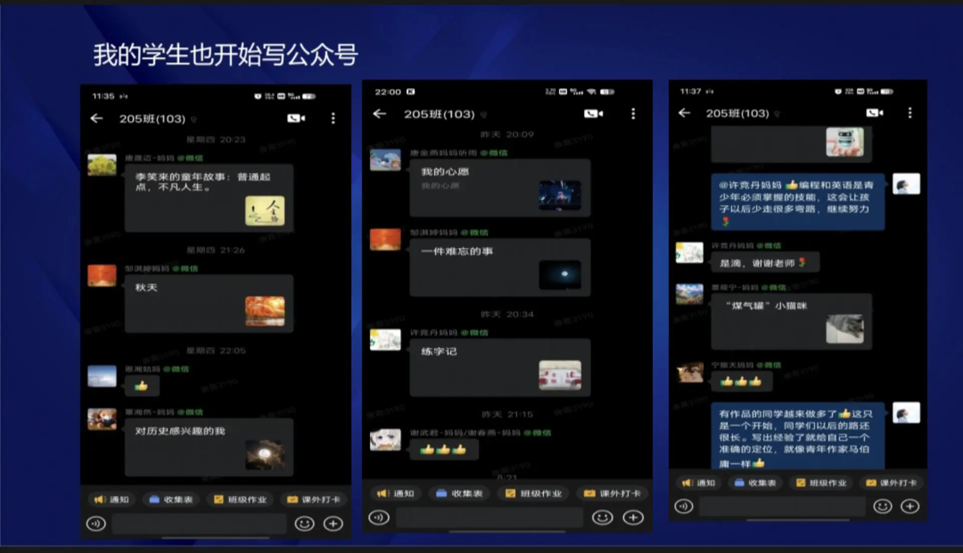 他们发上班群,我会抽时间给他们点评。如果学生写出了真情实感,我就会给他们搭赏。我跟他们说,小小奖励,大大鼓励,这只是一个开始,你们未来的路还很长,希望你们多输入,多输出,打磨好写作,这个可复制技能。其他学生看到这么多同学开始创作,并且得到老师的肯定。他们也跃跃跃试了。