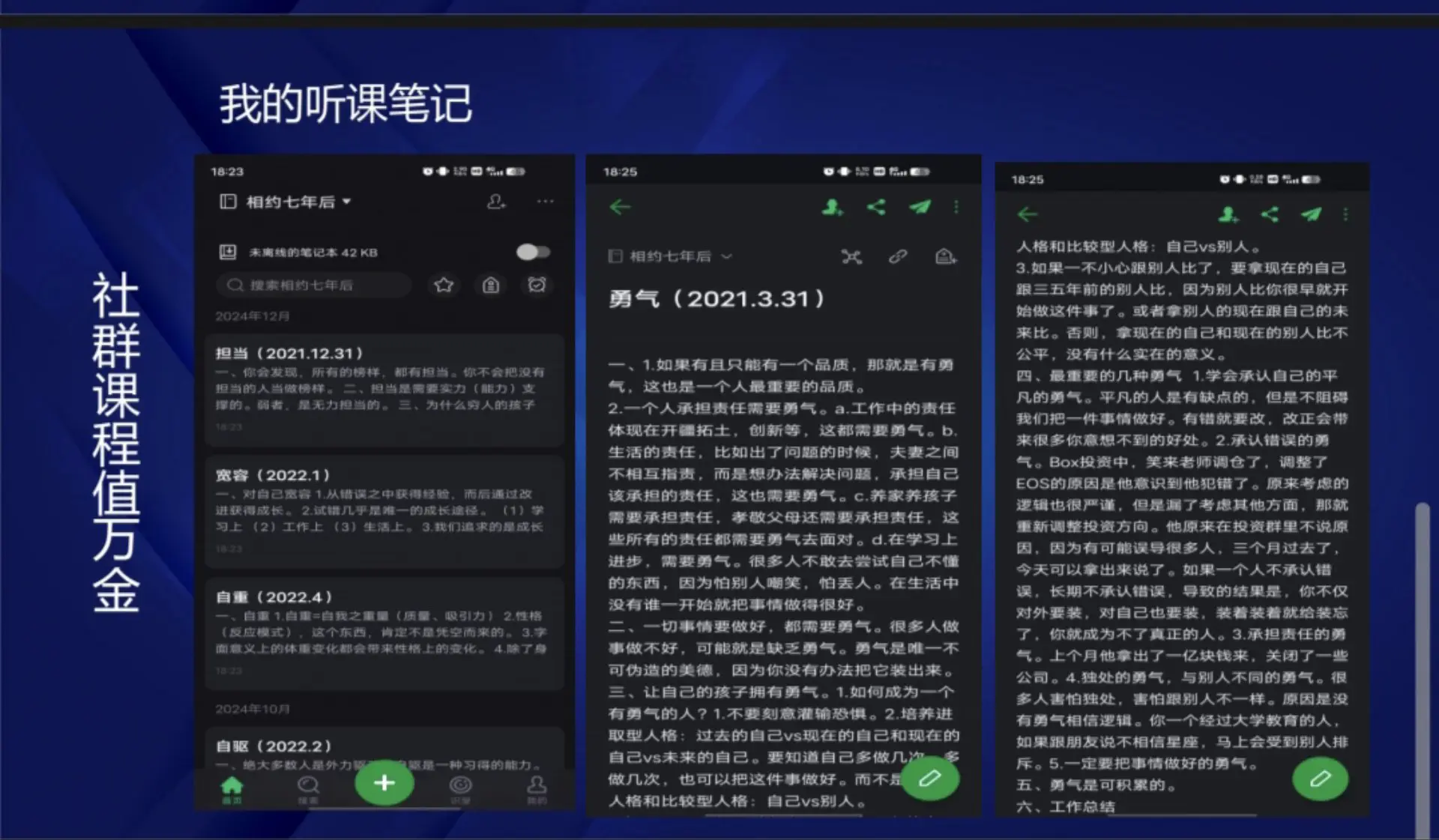 课程就像一个外表看起来很普通的苹果但是这个苹果甜脆多汁好吃有营养。比如相约7年后肖娜老师从2020年6月开始用每个月的最后一天讲。2020年6月到2022年5月肖娜老师讲的主题关于精神品质比如担当勇气宽容自重等等。我利用暑假时间先自己听一轮做好笔记然后选择一些适合孩子听的再和孩子们一起听。以前和。很多道理我都懂但是没有像校乐老师这样子抛开现象见本质的思考。可以说这些课程内容重塑了我的价值观。下图是我的一些听课笔记。