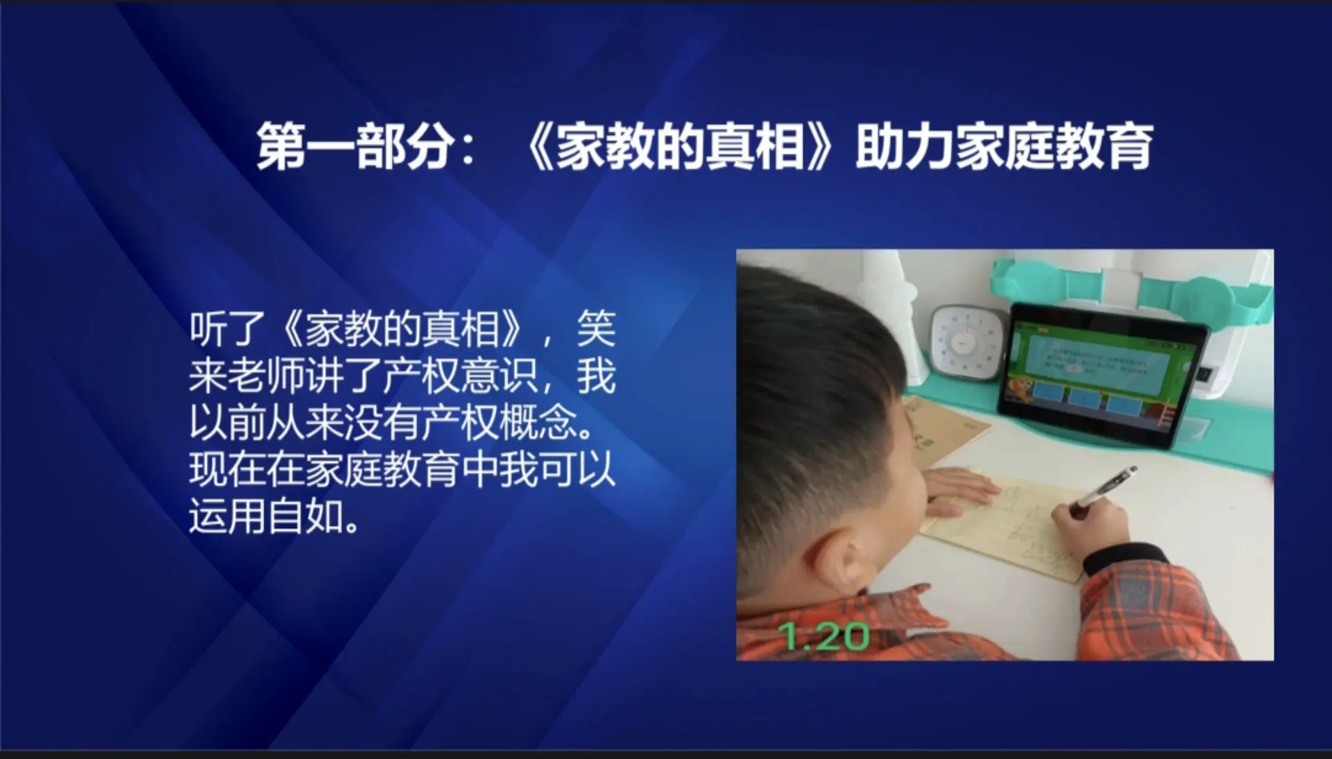 。听了家教的真相,肖乐老师讲了产权意识,我以前从来没有产权的概念,比如儿子在用平板看网课时,有时候会打开小红书刷我以前就叫他别刷了别刷了,对眼睛不好。学习产权这一刻后,我就懂得这么教育儿子。あ。这台平板是我用钱买的,如果你不遵守规则,我就要收回来,请你分清楚哪些事是重要的。先做重要的事情。儿子就会觉得这台平板虽然说给他用,但是那是妈妈用钱买的,不仅会遵守规则,还会对钱感兴趣,钱能买来这么好的东西是怎么赚的呢?课程为我儿子秦永嘉种下了一颗好种子。