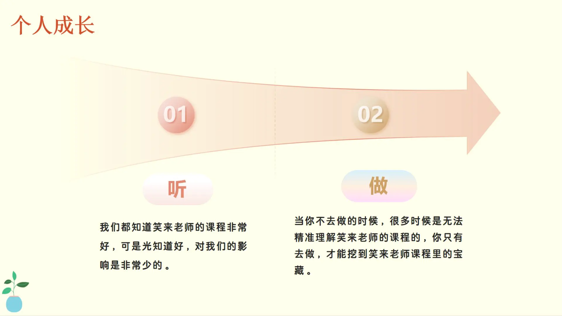 个人成长知道到做到,我们都知道肖雅老师的课程非常好,可是光知道好,对我们的影响是非常少的。当你开始去按照肖雅老师课程的方法去做的时候,哪怕是一个细小的知识点,比如在一些小时教程里,肖雅老师说,当我们习得一个新技能的时候,他可能需要我们完成多个任务,并且多个任务之间还可能需要相互协调。然后呢,他就举了一个学习蛙泳的例子,先学习上肢动作,然后下肢动作和呼吸动作,先学单一动作,然后在两个动作组合在一起,练熟了之后呢,在三个动作组合在一起,即使三个动作你都练熟了,你就能游得好游得快吗?不是的呀,。