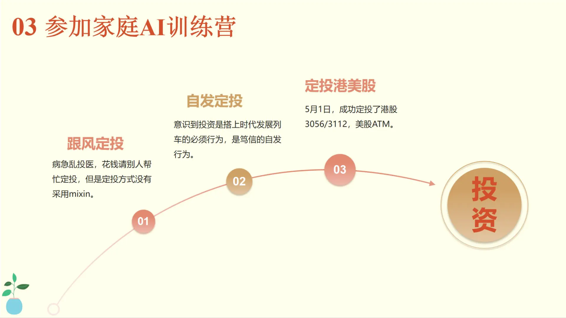 我最开始想定投,仅仅只是看到肖兰老师讲投资战友们分享定投成果属于跟风行为。而在线下课,文涛老师通过讲4次工业革命的变革,让我意识到投资是搭上第四次科技变革的必须行为是赌性的自发行为,并且也让我下定决心去香港开港卡定投30563112。5月1号的时候呢,成功定投了港股30563112美股ATM。