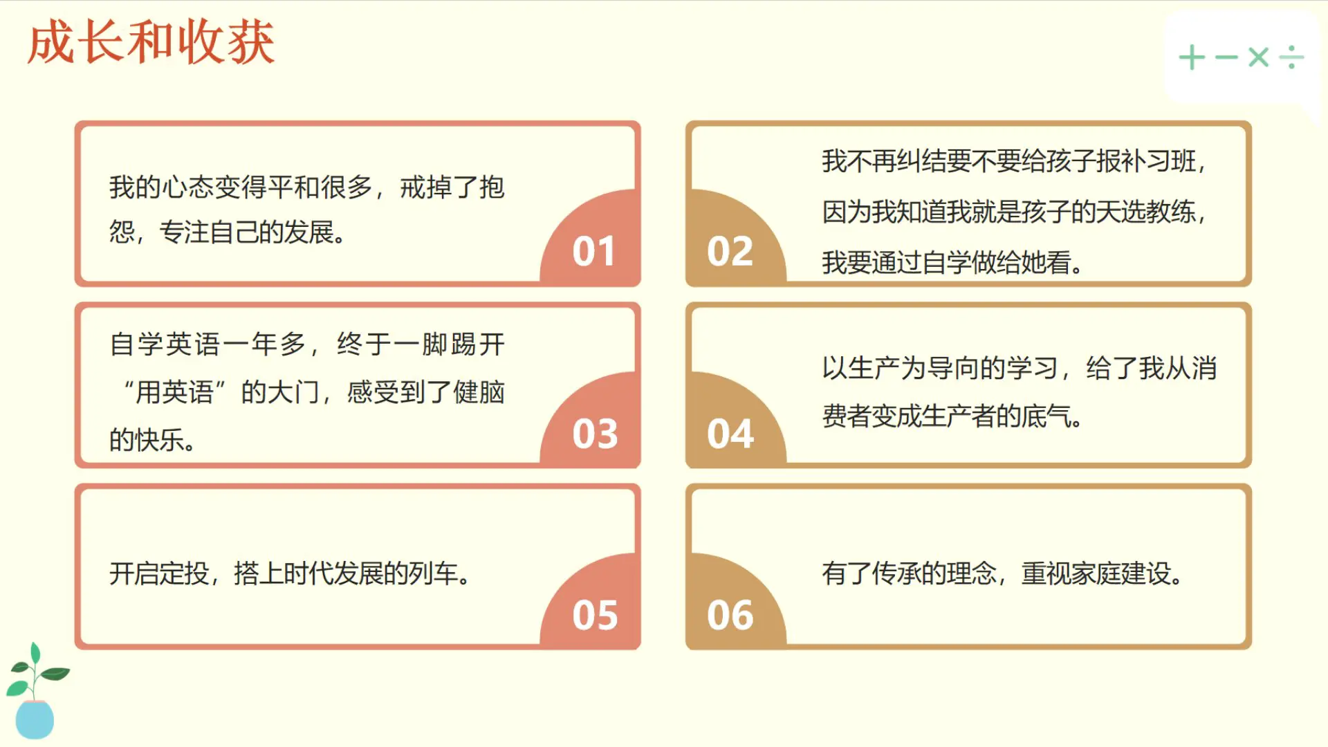 加入富足人生社群的两年里,我的心态变得平衡很多,戒掉了抱怨,专注自己的发展。我不再纠结要不要给孩子报补习班。因为我知道我就是孩子的天选教练。我要通过自学做给他看。自学英语一年多,终于一脚踢开用英语的大门,感受到了建脑的快乐,以生产为导向的学习,给了我从消费者变成生产者的底气,开启定投,搭上了时代发展的列车,有了传承的理念,重视家庭建设。以上呢就是我的分享,感谢校乐老师创建富足人生社群创作了这么多好的课程,感谢苏珊老师的邀请,感谢各位战友的聆听,谢谢大家。。